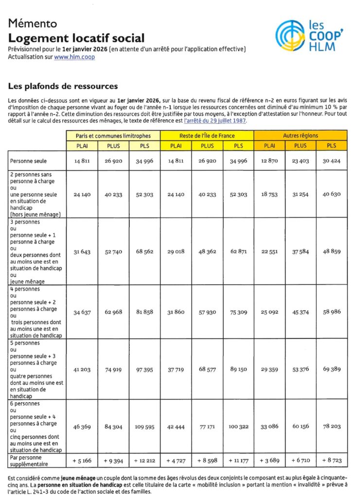 - d’avoir des revenus qui ne dépassent pas le montant des plafonds de ressources fixé par arrêté ministériel (voir tableau des ressources ci-dessous – Pour l’OPH de la Meuse, se référer aux colonnes « Autres régions »).
